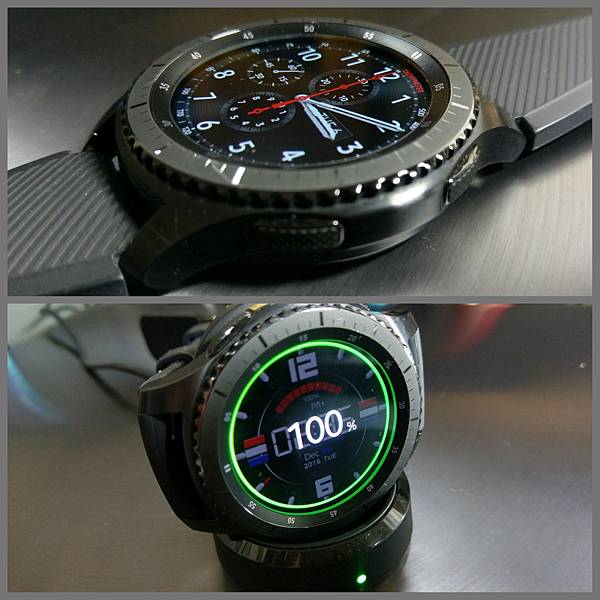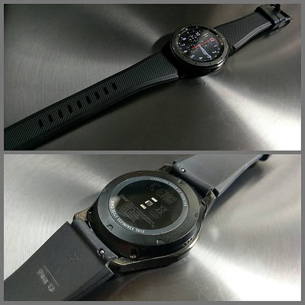 誠如Frontier(探險家)的命名,外型就粗曠豪邁許多,加上鏡面是Gorilla SR+強化玻璃與錶身的金屬材質達到美國軍規認證,十分適合戴著做戶外休閒與上山下水的極限運動。Gear S3採用的是22mm的標準錶帶規格,可更換任何款式的22mm錶帶,背面是心跳感測器,充電的部分只要放到有磁性的無線充電座就會自動充電並顯示電量,十分方便;錶身右側有兩個按鈕,上面那顆是返回鍵,下面是首頁/選單鍵,長壓可選擇關機/觸控靈敏度/省電模式。