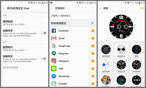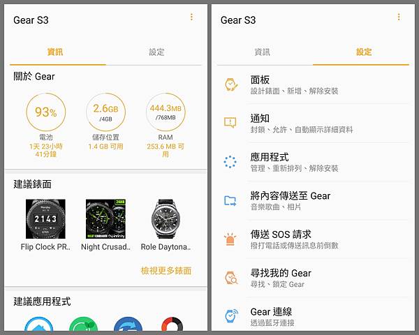 Gear S3的相關設定必須在手機上先安裝Samsung Gear APP透過連線配對後才能變更設定,在Gear APP裏頭可以看到Gear S3的資訊,滑動到旁邊的設定頁面就可以設定想要的項目,例如把想要的歌曲或照片同步到手錶上,選擇哪些APP可以在手錶上顯示通知,手錶的面板也可以依照自己的心情或喜好任意變更!