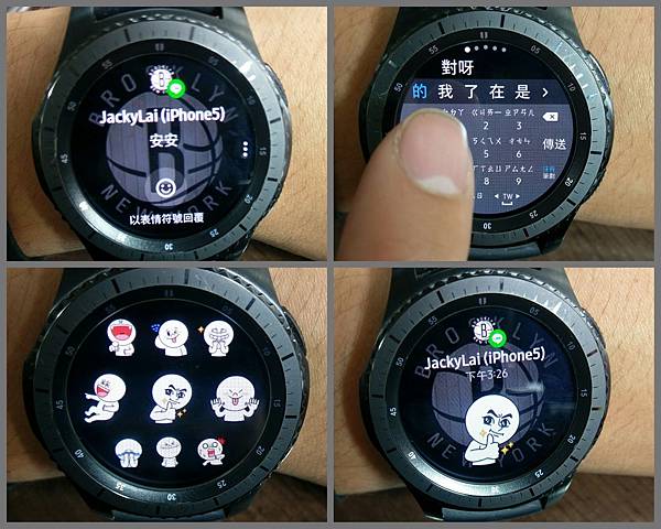 如果手機收到了一些訊息, Gear S3也會同步收到通知,甚至可以直接在手錶上打字回覆,但要在1.3吋小小的螢幕打字實在不大方便,打字的任務還是交給手機吧!另外可以語音輸入,但測試的結果似乎只能辨識英文?對方如果傳LINE的貼圖也可以正常顯示(動態貼圖不會動),而且也可以用內建貼圖快速回覆喔!
