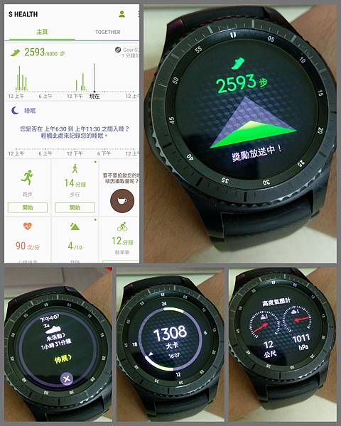 手機端另外下載S Health APP,可同步Gear S3的運動與健康資訊,例如步數,睡眠品質,每分鐘心跳數,消耗卡路里數,登階數….等等,如果很懶一直閒置,Gear S3還會提醒你該起身動動囉!另外Gear S3內建高度表與氣壓計,對於熱愛登山的登山客是很實用的功能!