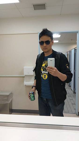 在廁所看著鏡子裡的我,墨鏡黑夾克的,